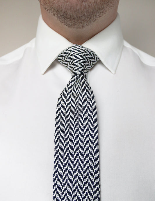 Herringbone Design Knitted Tie With Square End - Navy Blue