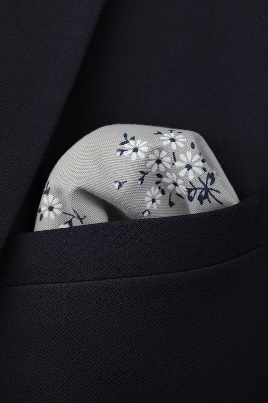 100% Cotton Floral Print Pocket Square - Cream & Navy