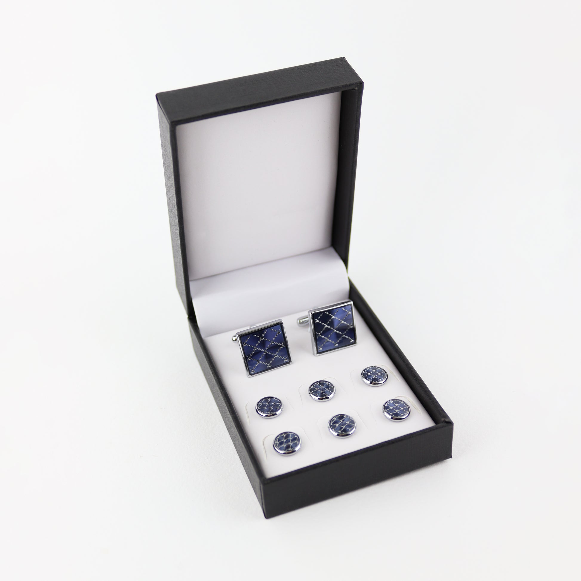 Add the finishing touch to your outfit with our set of 6 dress studs and 2 cufflinks. These navy & silver cufflinks make the perfect gift as it comes boxed in a luxurious black textured display box. They are made from the highest quality and guaranteed to be the perfect touch to your dress shirt for your special occasion.
