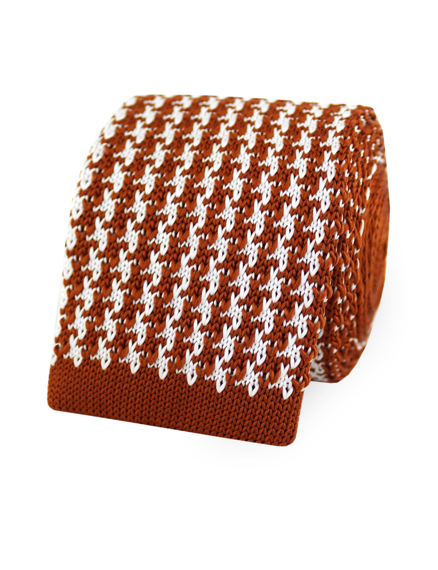 Houndstooth Design Knitted Tie With Square End - Rust Orange