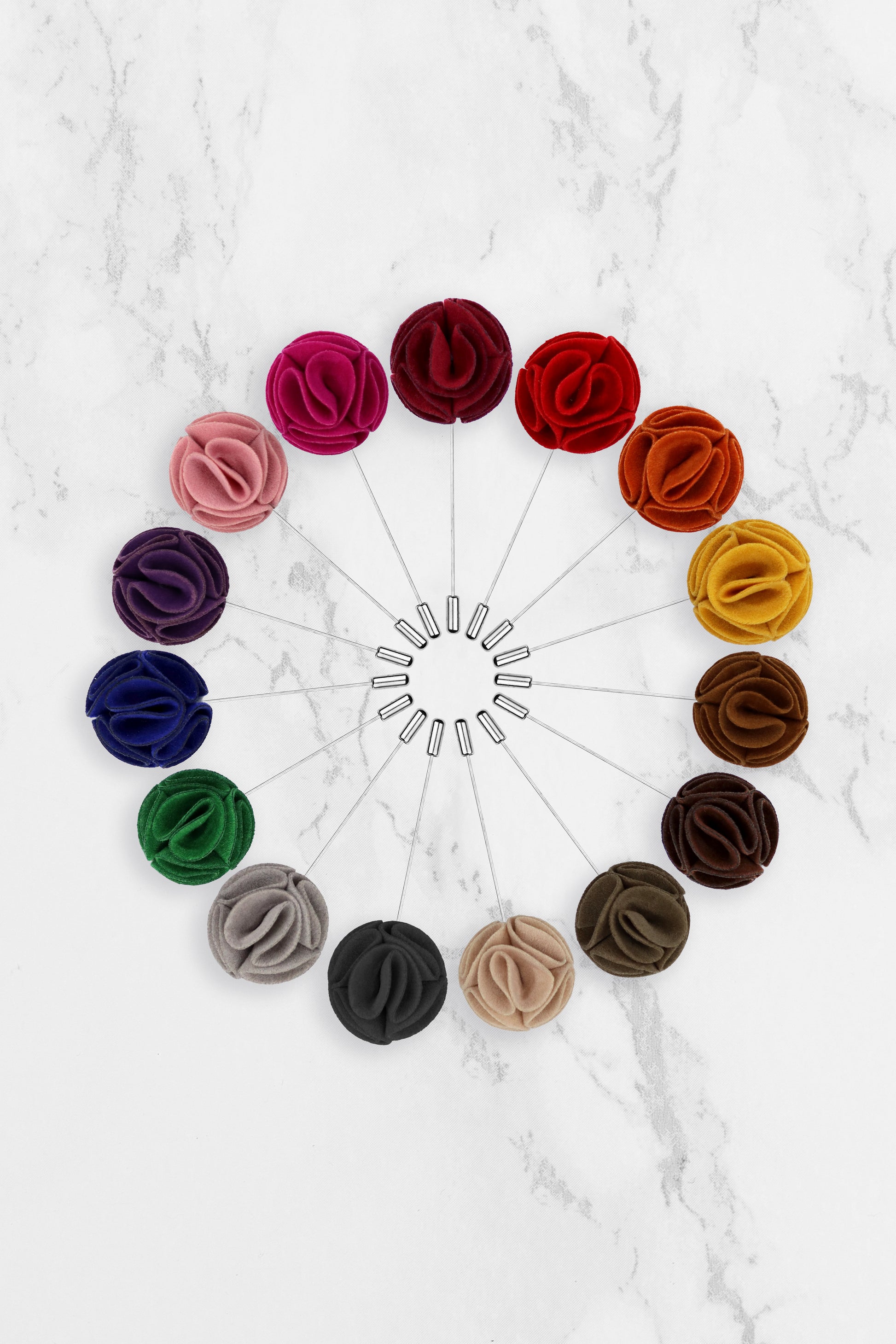 A beautiful flower lapel pin handmade using felt cotton for a soft yet sturdy finish. Attaches easily to your blazer, coat collar, smoking jacket, or tailcoat.